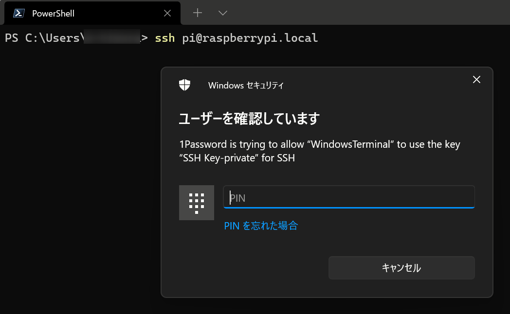 登録した秘密鍵のfingerprintが表示されれば設定成功です。実際にsshして試してみましょう。sshする際、初回は1passwordの認証画面が表示されます。