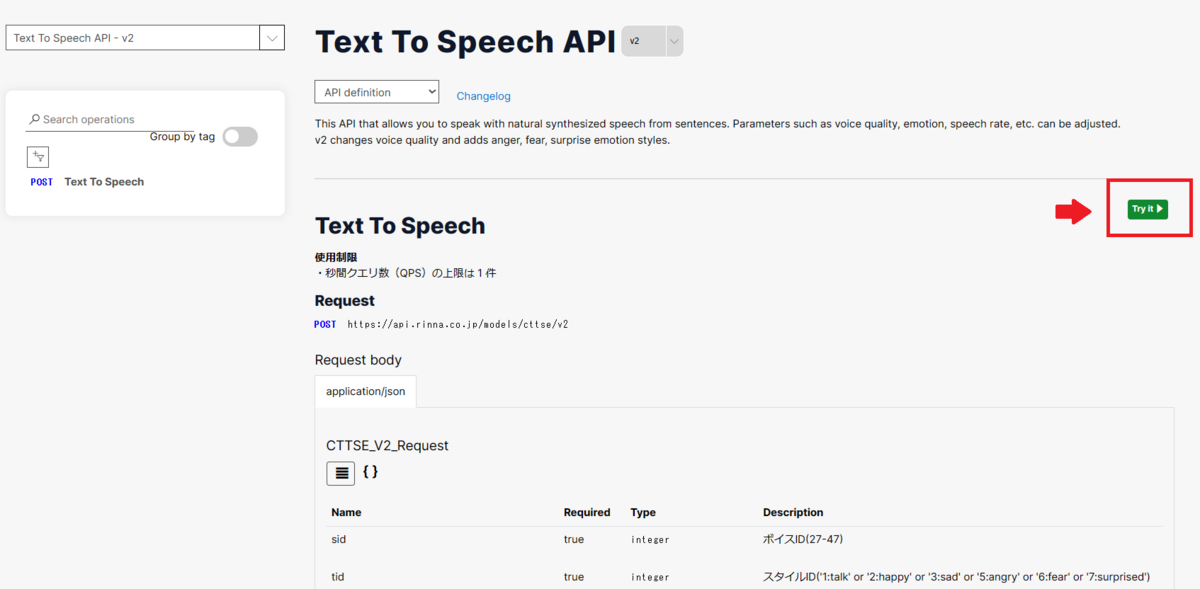ホーム画面から次のように選択していきます。 Our APIs => Free => Text To Speech API - v2